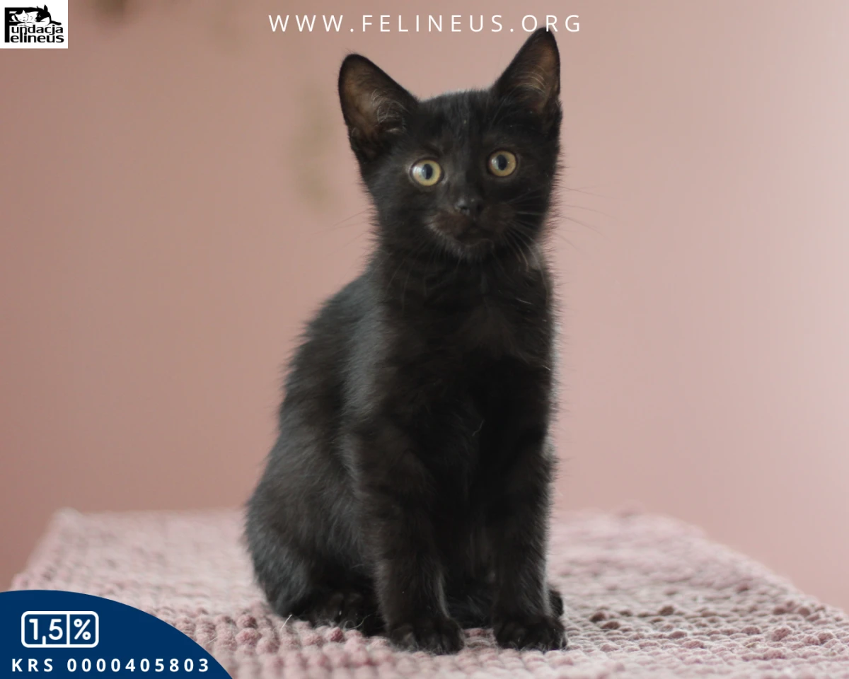 Czorcik - kocurek urodzony w lipcu 2025. Czorcik to urodzony koci model. Z ogromną przyjemnością pozuje przed aparatem. Grzecznie siedzi i jedynie zmienia pozy, aby jeszcze lepiej zaprezentować swoje piękne, czarne, lśniące futerko. Czorcik jest pogodnym i wesołym kocim dzieciakiem, który będzie wspaniałym członkiem rodziny. Chętnie zamieszka w domu z innym kotem lub zabierze do nowego domu brata lub siostrę.