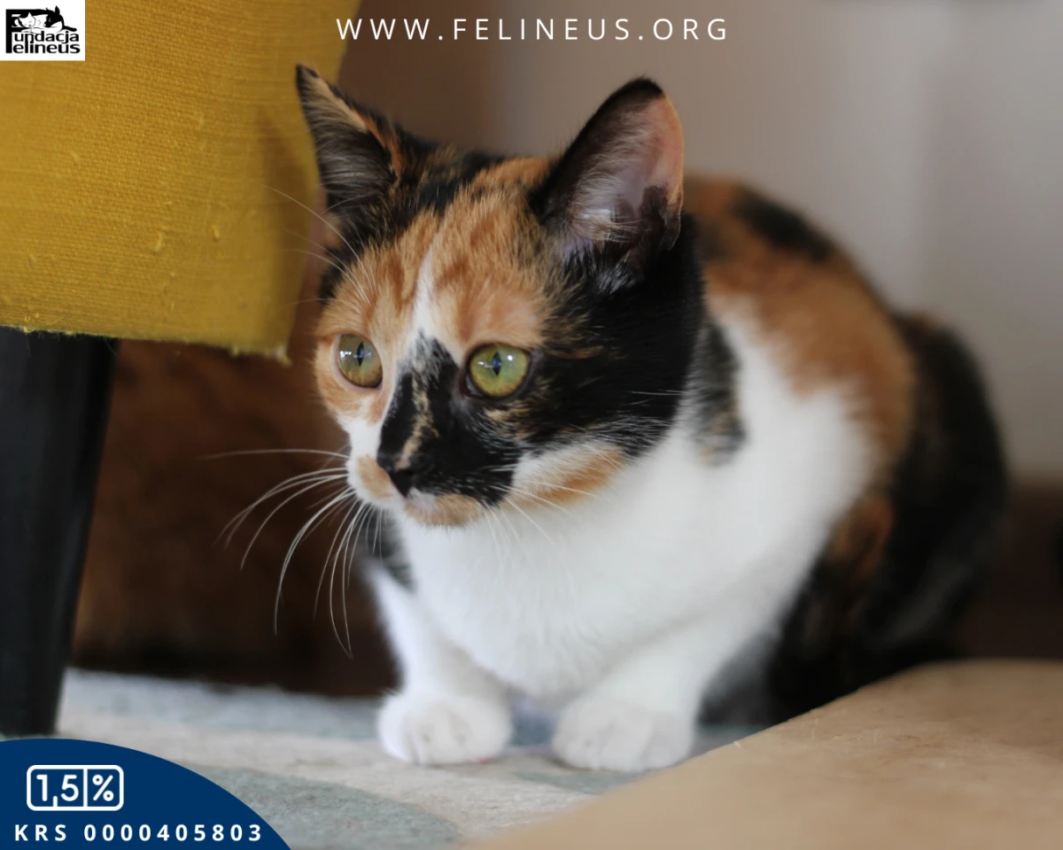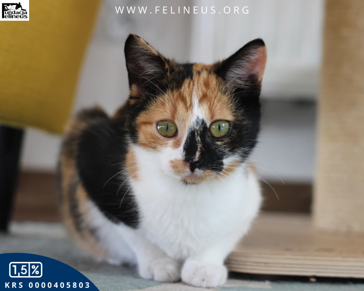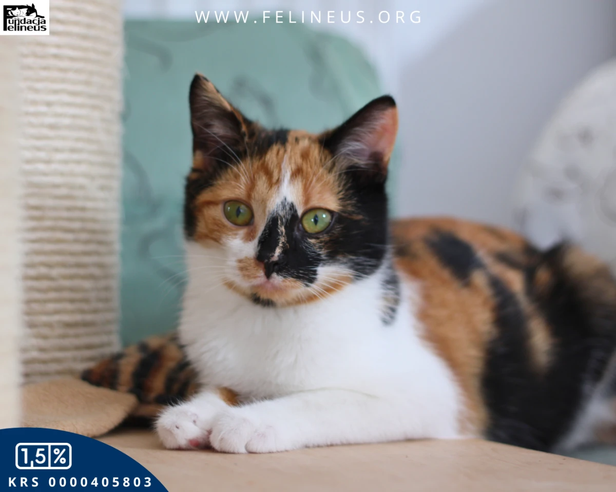Fuksia to kolorowa kotka urodzona w lipcu 2025r. To dama, która świetnie odnajduje się w towarzystwie rodzeństwa oraz obcych kotów. Niestety wśród ludzi nie jest już tak odważna. Jest dość płochliwa, a by zaufać człowiekowi potrzebuje nieco więcej czasu. Najszybciej złapiesz z nią kontakt poprzez wspólną zabawę. Chętnie bawi się wędką, potrafi łapą zaczepić, aby przypomnieć, że czeka na porcję kocio-człowieczego szaleństwa. Kotka potrzebuje czasu i dużo cierpliwości, żeby się otworzyć. Noc spędza z domownikami w łóżku, czeka aż zgaśnie światło, by ułożyć się na nogach.