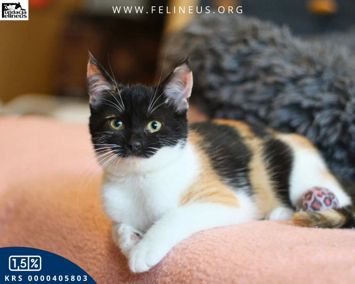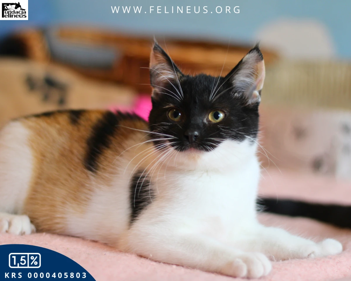 Marzenka to kotka urodzona w czerwcu 2025r. Jej futerko ma barwę trikolor o mocnych wyraźnych kolorach. To kociak o niesamowitej energii. Biegi, skoki i zapasy z innymi kotami z domu tymczasowego wypełniają jej cały dzień. W domu tymczasowym przebywa wraz z siostrą, ale dogada się też z innymi kotami. Do nowego domu chętnie przeprowadzi się z siostrą lecz nie jest to warunek konieczny. Preferujemy dom z zabezpieczeniem okien/balkonu.
