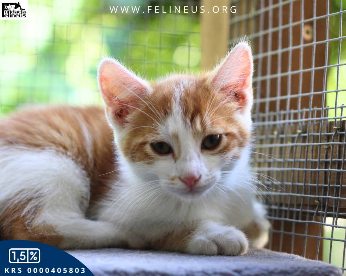Selen to rudo biały kocurek urodzony w czerwcu 2025 r. Kociak trafił pod opiekę fundacji z licznym rodzeństwem. Chłopak super dogaduje się z kotami. Lubi obecność człowieka, chętnie bawi się z nim i towarzyszy. Selen szuka stałego domu. Chętnie zamieszka z którym bratem lub siostrą. Lub zaprzyjaźni z innym kotkiem. Dla Selena szukamy domu niewychodzącego. Z zabezpieczonymi oknami i balkonem.
