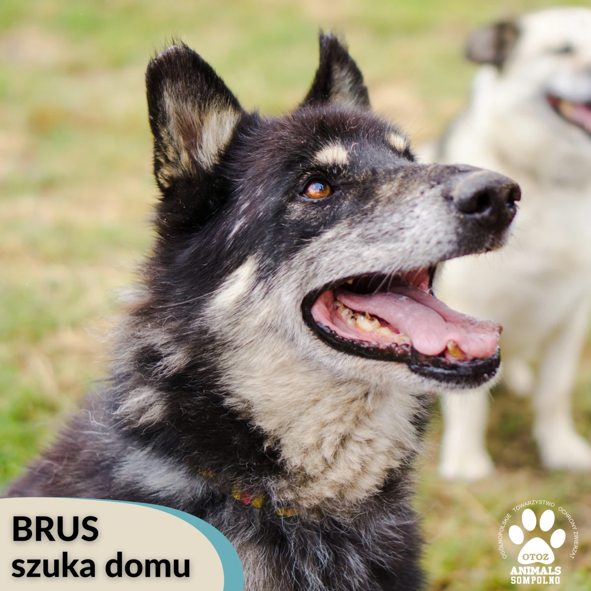 Jest wesołym i kontaktowym psem. Kiedy wykonujemy swoje obowiązki, on obserwuje nasz każdy ruch i cierpliwie czeka, aż wejdziemy do jego kojca i będziemy mogli go przytulić. Ma w sobie dużo miłości, którą obdarza każdego z nas, dlatego każdego członka rodziny będzie kochał tak samo. Brus jest gotowy na swoją ostatnią podróż w życiu - do domu, gdzie na stare lata będzie mógł się wygrzać, na miękkim posłaniu. Zgadza się z innymi psiakami, obecnie mieszka z Bazylką i Koriną.