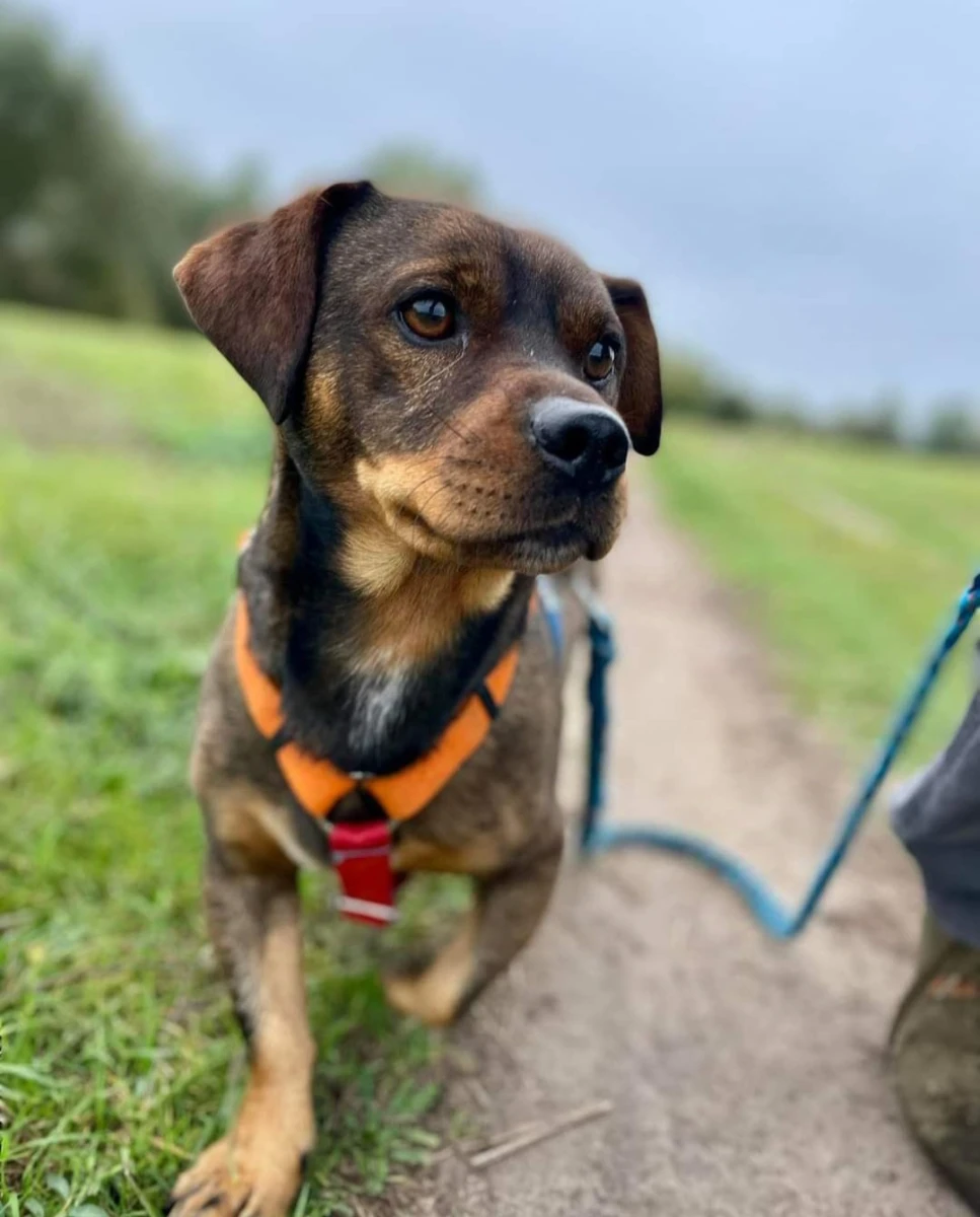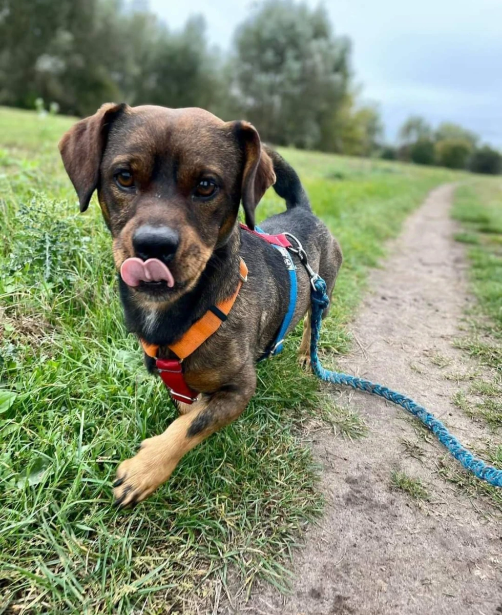 Na spacerze nie reaguje, na psy, rowerzystów, samochody... węszy, dzielnie spaceruje ale co chwilę zerka na człowieka i podskakuje jakby chciał wyrazić swoją miłość.