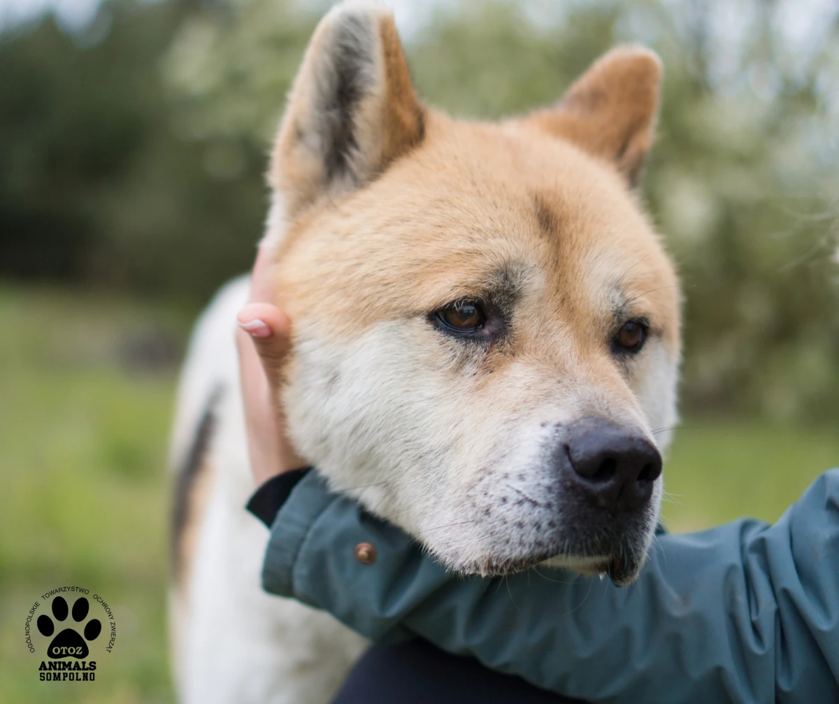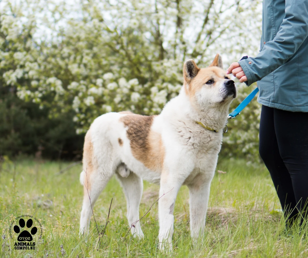 Ma ok. 10 lat. Trafił do nas z gminy Sompolno 29 lutego. Jest w typie rasy Akita.