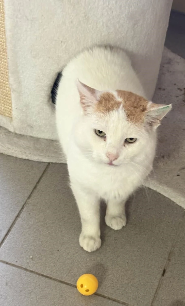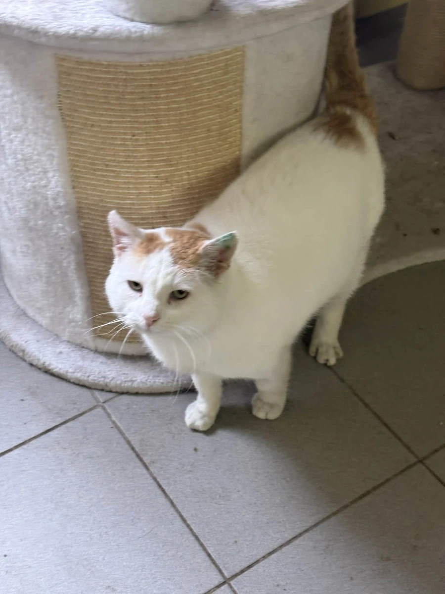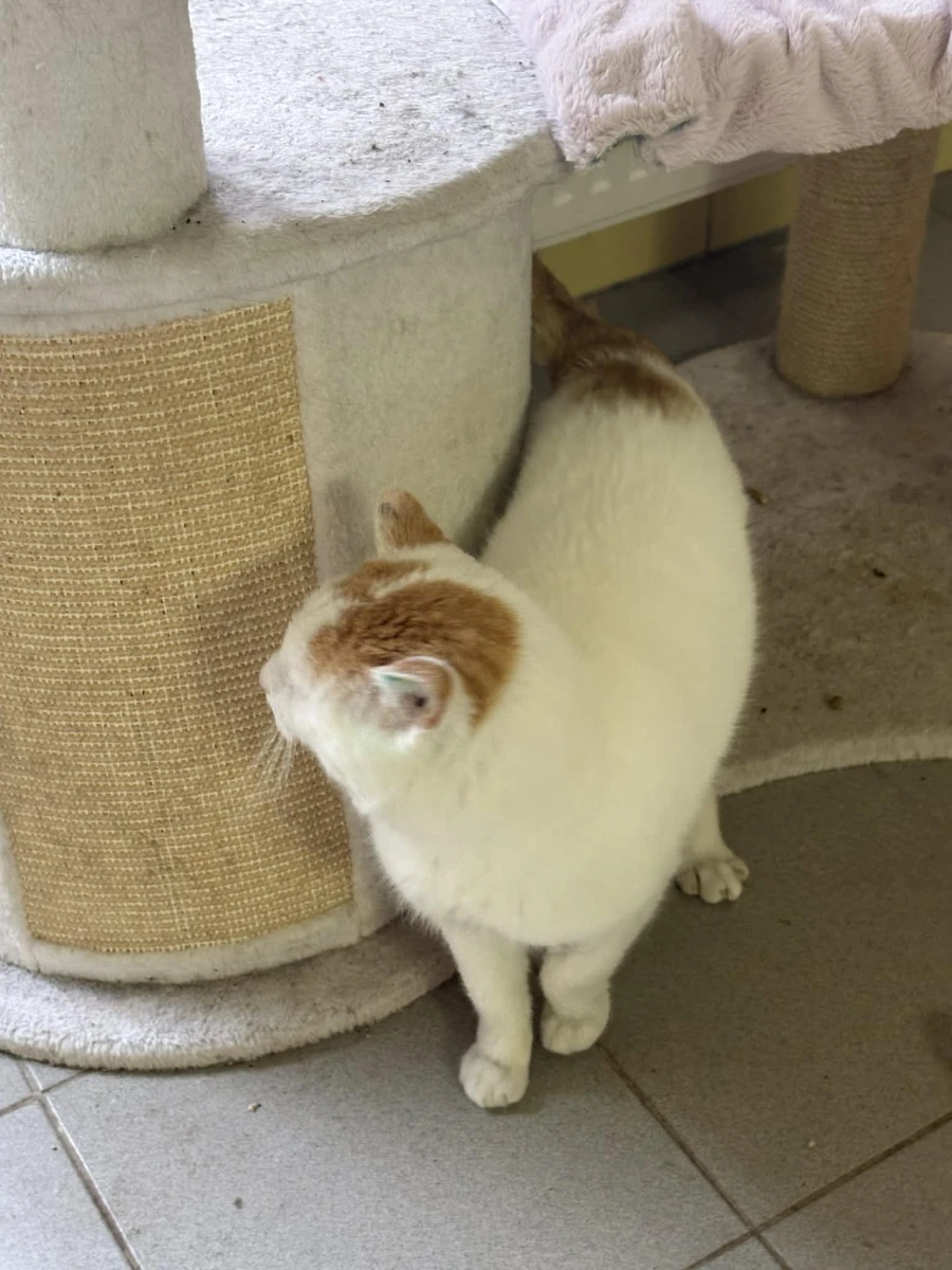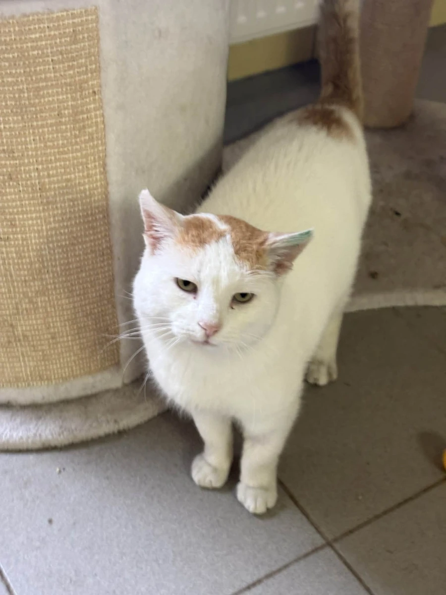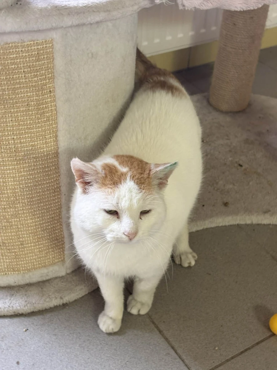 Boguś to przemiły kocurek: biały z rudymi dodatkami. Początkowo onieśmielony, chował się w budce. Po delikatnej zachęcie wyszedł i okazał się uwielbiającym głaskanie pieszczoszkiem.