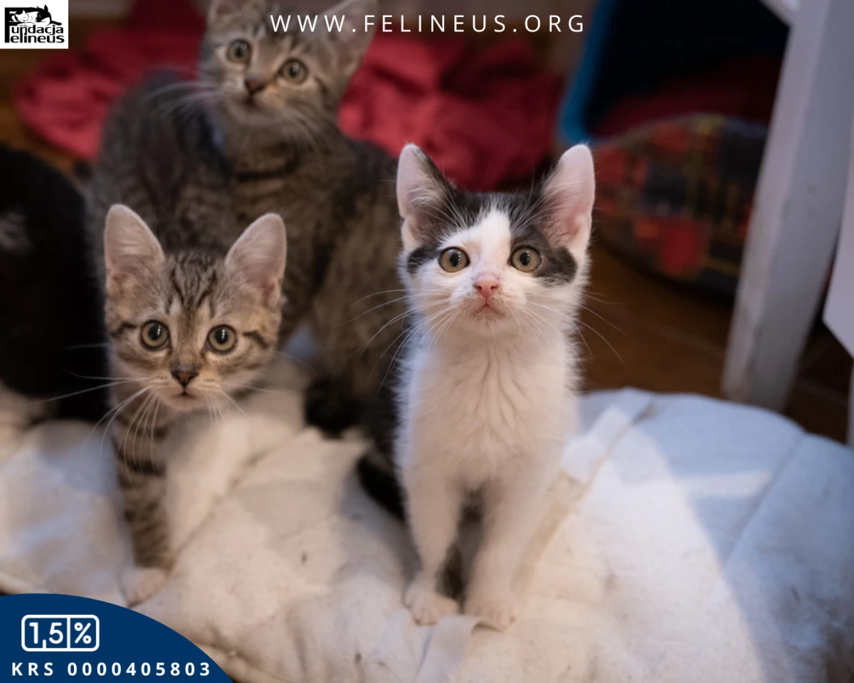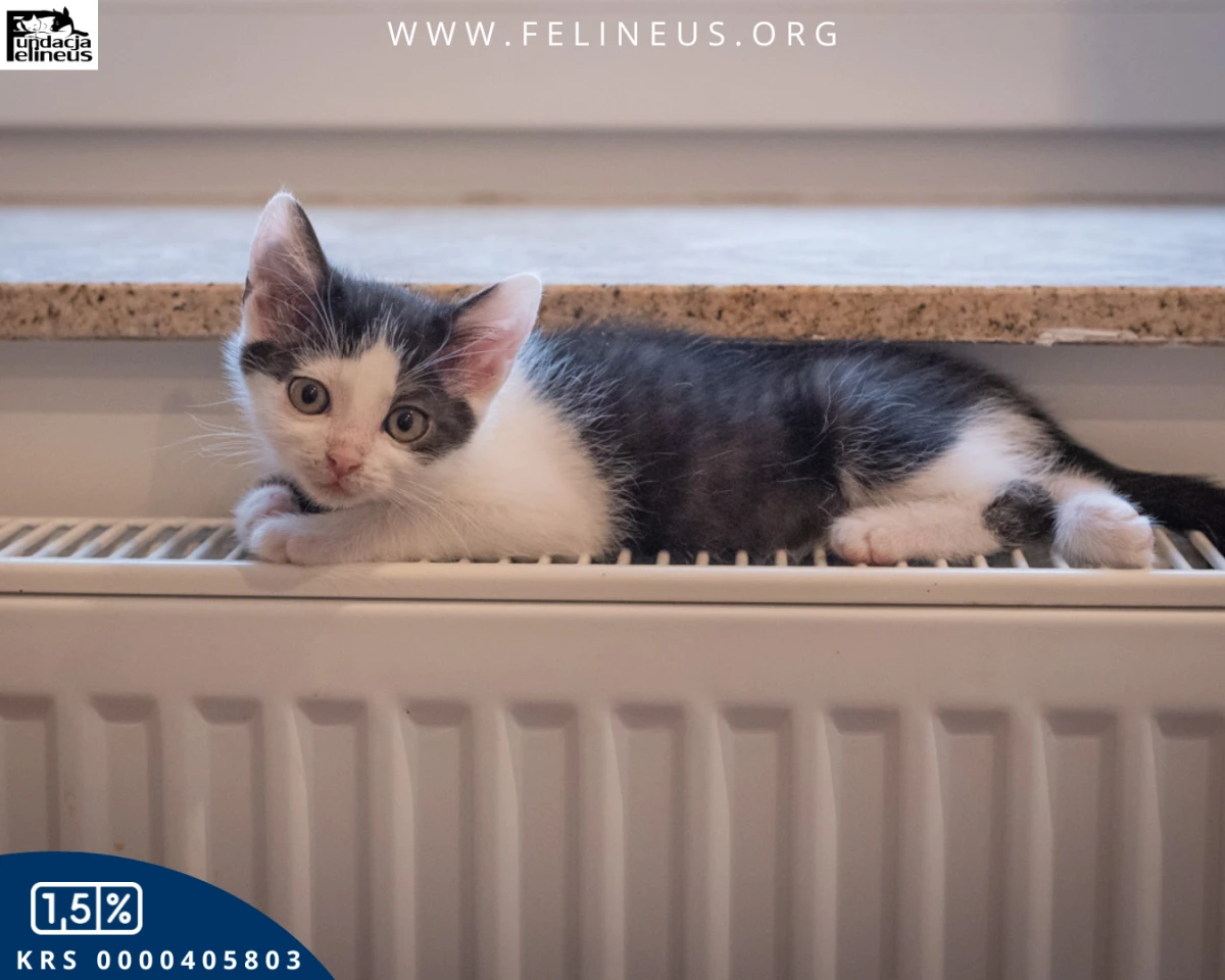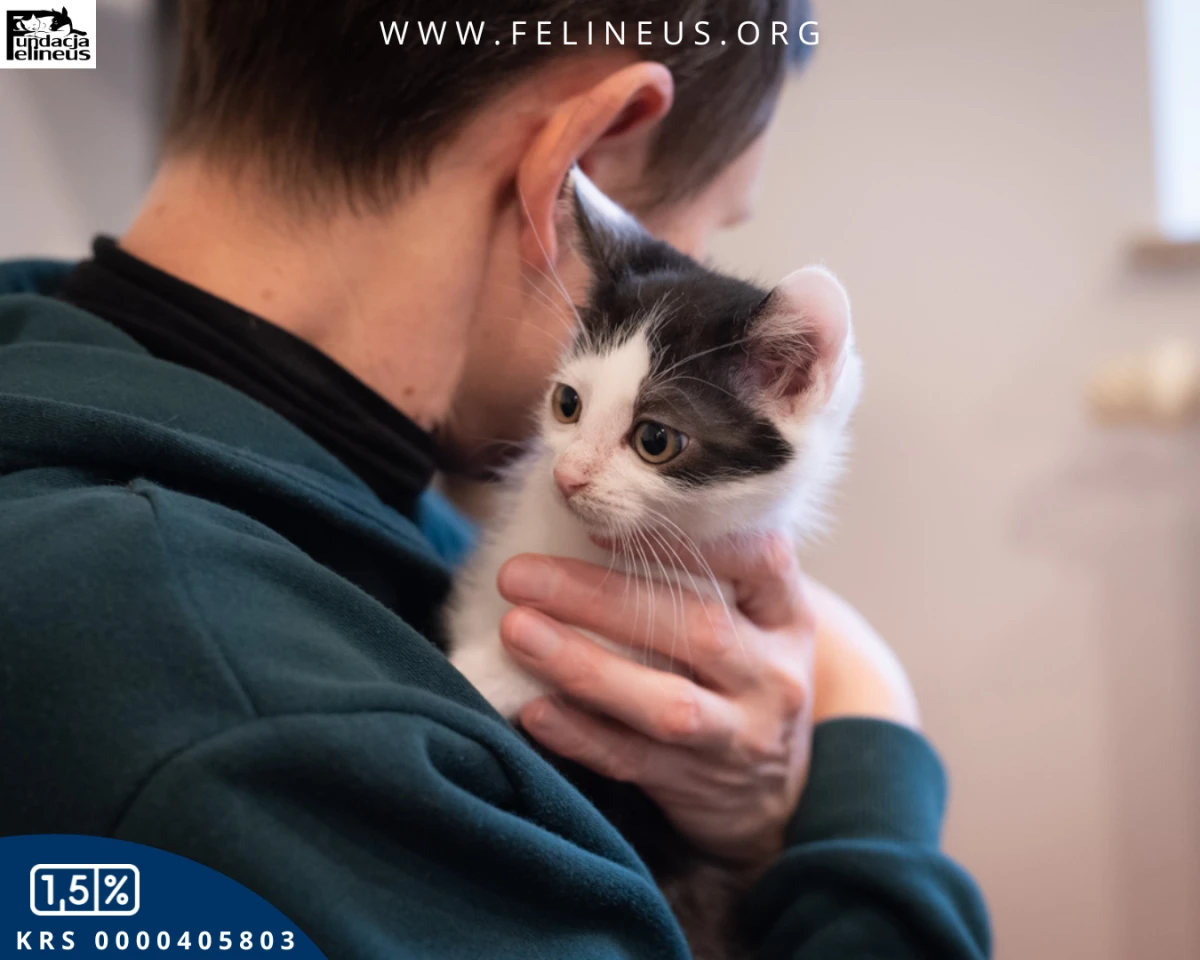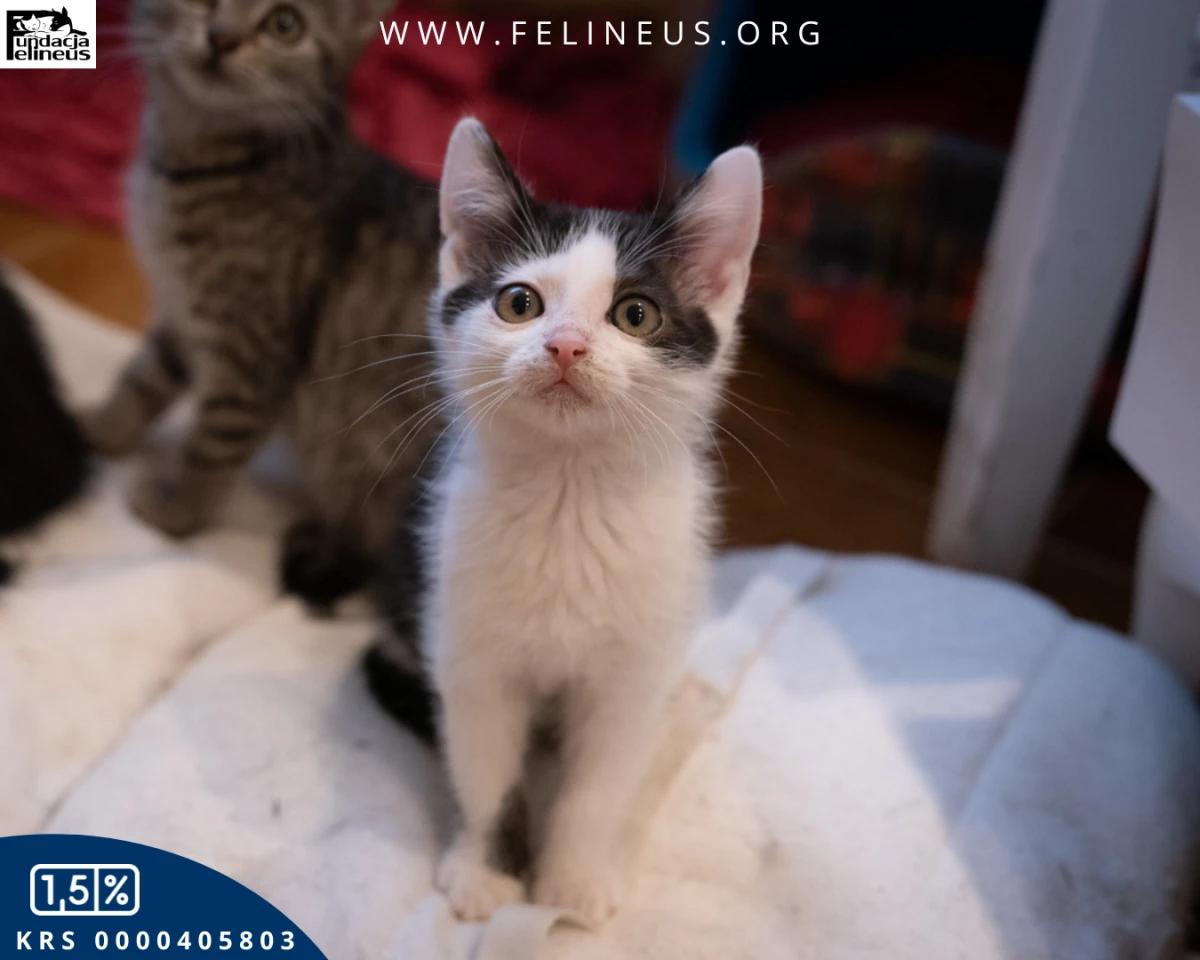 Kosmos – kocurek urodzony w październiku 2023r. To najdrobniejszy i najspokojniejszy z rodzeństwa młody gentleman. Bardzo lubi być głaskany, ale nie pogardzi też dobrą zabawą. Ulubionymi zabawkami Kosmosa są piłeczki i wędki. Kocurek szuka kochającego domu, do którego może iść sam, lub z którymś z kociaków z rodzeństwa.