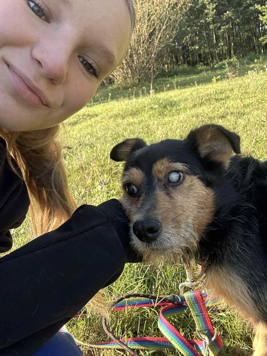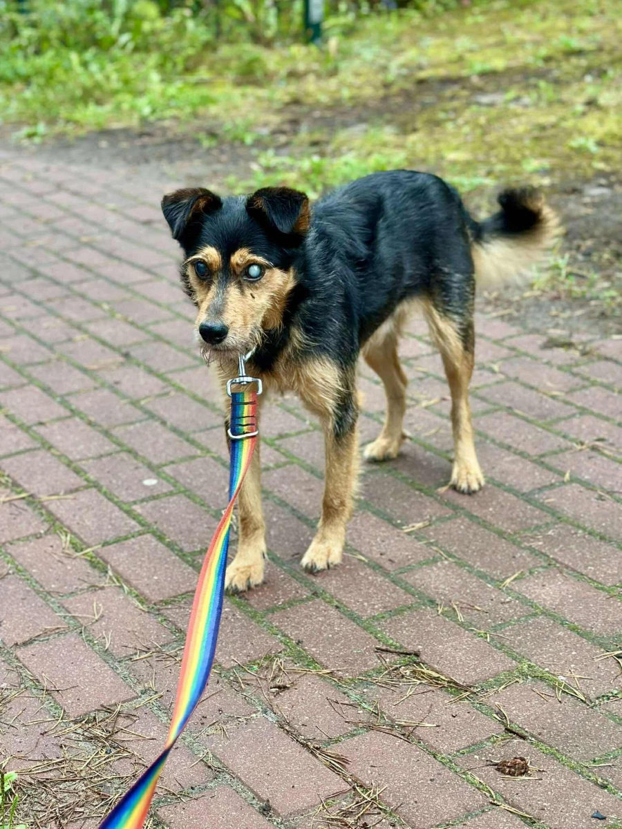 Ollie to prawdziwy skarb na czterech łapkach - cudowny, łagodny i niesamowicie kochający pies, który pomimo tego, że nie widzi, świetnie radzi sobie w codziennym życiu. Szybko przywykł do schroniskowej rutyny, coraz lepiej mapuje teren, a nawet na spacerach coraz rzadziej wpada w przeszkody. Idzie bez pośpiechu, spokojnie, dokładnie obwąchując wszystko po drodze - bo dla niego zapachy to cały świat.