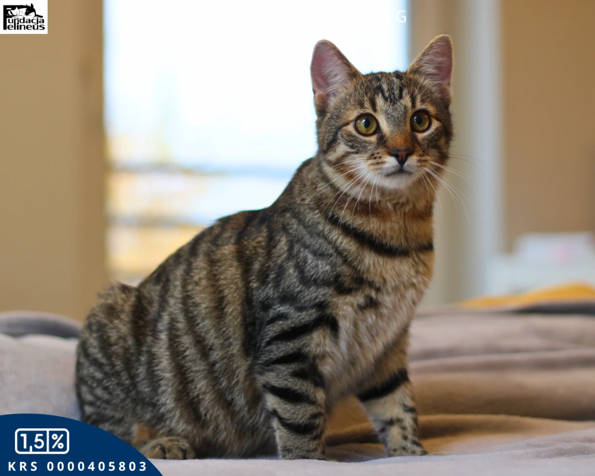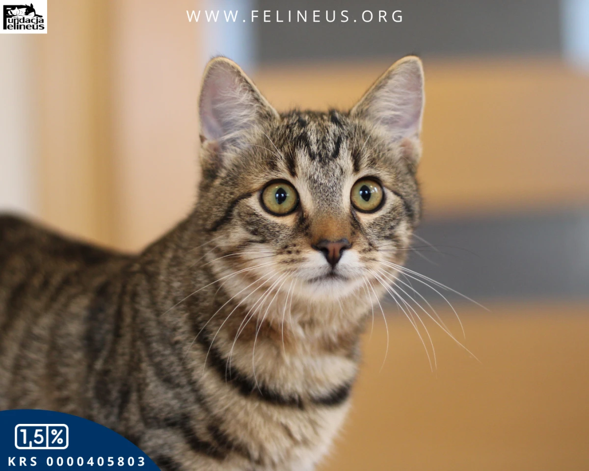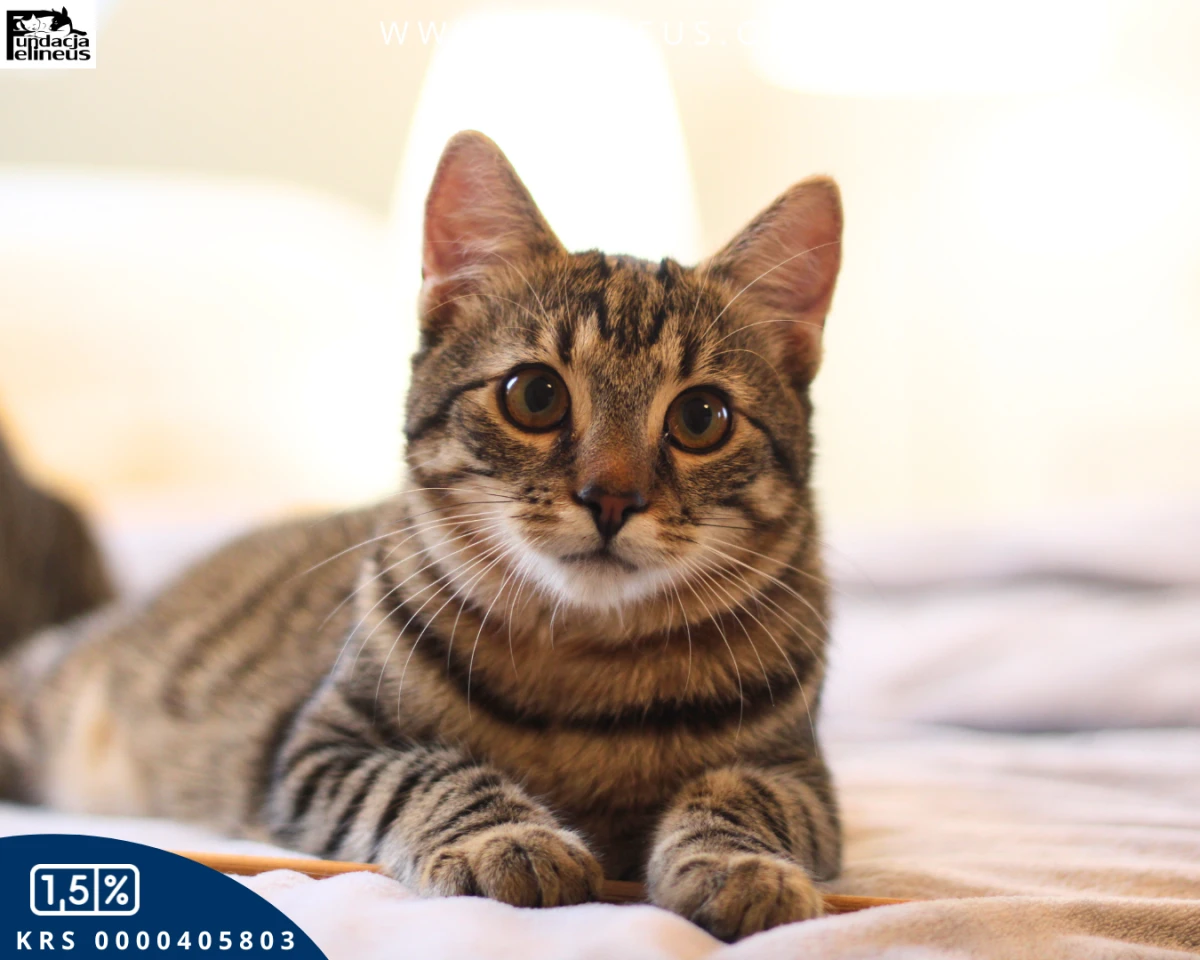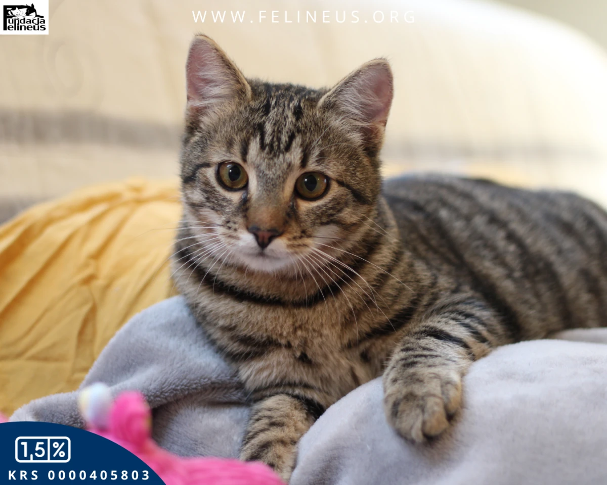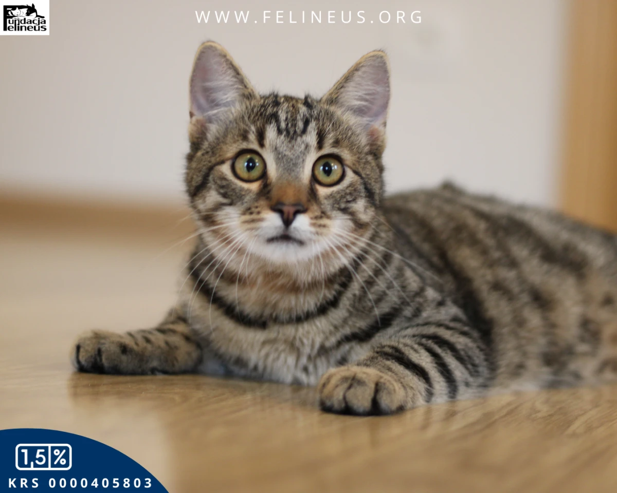 Wrzosik - kocurek urodzony w czerwcu 2025. Wrzosik to najbardziej rozmruczany i przytulaśny kocurek jakiego znamy. Na sam widok człowieka włącza się mu tryb "traktor". Kocurek nie widzi świata poza człowiekiem. Chociaż kocim towarzystwem również nie pogardzi. Lubi zabawy z innymi kotami - małymi i dużymi, dlatego poleca się do adopcji w dwupaku lub też chętnie zamieszka w domu gdzie jest już kot. Wrzosik z prędkością świata wbiega na człowieka żeby położyć się mu na kolanach, dać mu kocie całuski lub też żeby być ponoszonym na rękach albo na ramieniu. Ten mały szkrab na pewno szybko skradnie wasze serce. Kocurek szuka domu niewychodzącego z zabezpieczonymi oknami i jeśli jest to balkonem.