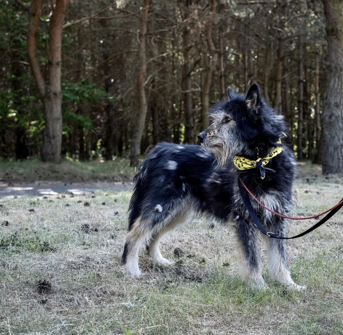 Dredo to pogodny chłopak, który spędza w schronisku już prawie 3 lata! Najwyższa pora, by ten kudłaty słodziak opuścił bramy schroniska u boku swojego nowego właściciela! Dredo to piesek piękny zarówno na zewnątrz, jak i w środku. Ma czarną, szorstką sierść, beżowe łapki, oczy jak dwa węgielki i uroczą bródkę. W nieznanych nam okolicznościach, Dredo zgubił zęba i z dumą prezentuje szparę między pozostałymi ząbkami. ;) Mimo, że z wyglądu przypomina mocno dojrzałego psa, jest psiaczkiem w średnim wieku. Przypuszczamy, że ma ok. 5-7 lat. Może być młodszy, ale ciężko ocenić jego wiek przez ubytki w uzębieniu. ;) Lubi towarzystwo człowieka, chętnie przyjmuje głaski w każdej formie i ilości. Ubóstwia wręcz głaskanie, a zwłaszcza po grzbiecie. Zwraca uwagę na człowieka i chętnie trzyma się w jego pobliżu. W stosunkach z ludźmi i innymi psami zachowuje się całkowicie bez agresji, choć zaszczeka jeśli zbliży się ktoś obcy. Jest karny i posłuszny, nie sprawia żadnych problemów. Uwielbia dawać upust swoim pokładom energii na schroniskowym wybiegu. Jest umiarkowanie aktywny, chętnie się bawi. W głowie mu jeszcze harce i gonitwy. Wypuszczony luzem na schroniskowy ogród ładnie wraca na zawołanie. Boks dzieli z Czelo, na wybiegu biega jeszcze z kilkoma psiakami. Fajnie się z nimi dogaduje, nie zaczyna konfliktów. Jeśli Dredo miałby zamieszkać w domu, w którym jest już pies, wymagamy spaceru zapoznawczego. Nie polecamy go do domu z kotami - jego instynkt teriera mógłby obudzić się na widok mruczka. Dredo może zamieszkać w domu z dziećmi w wieku szkolnym. :)