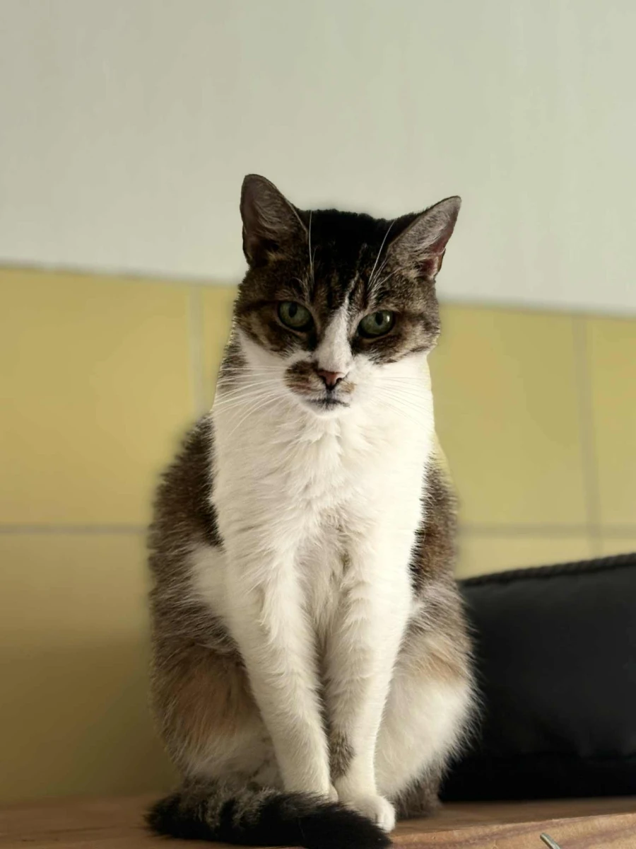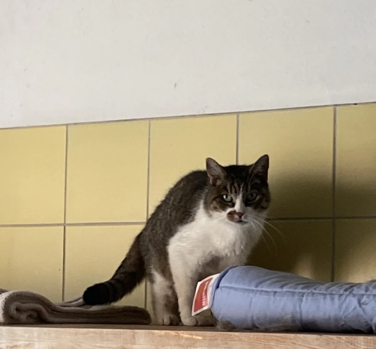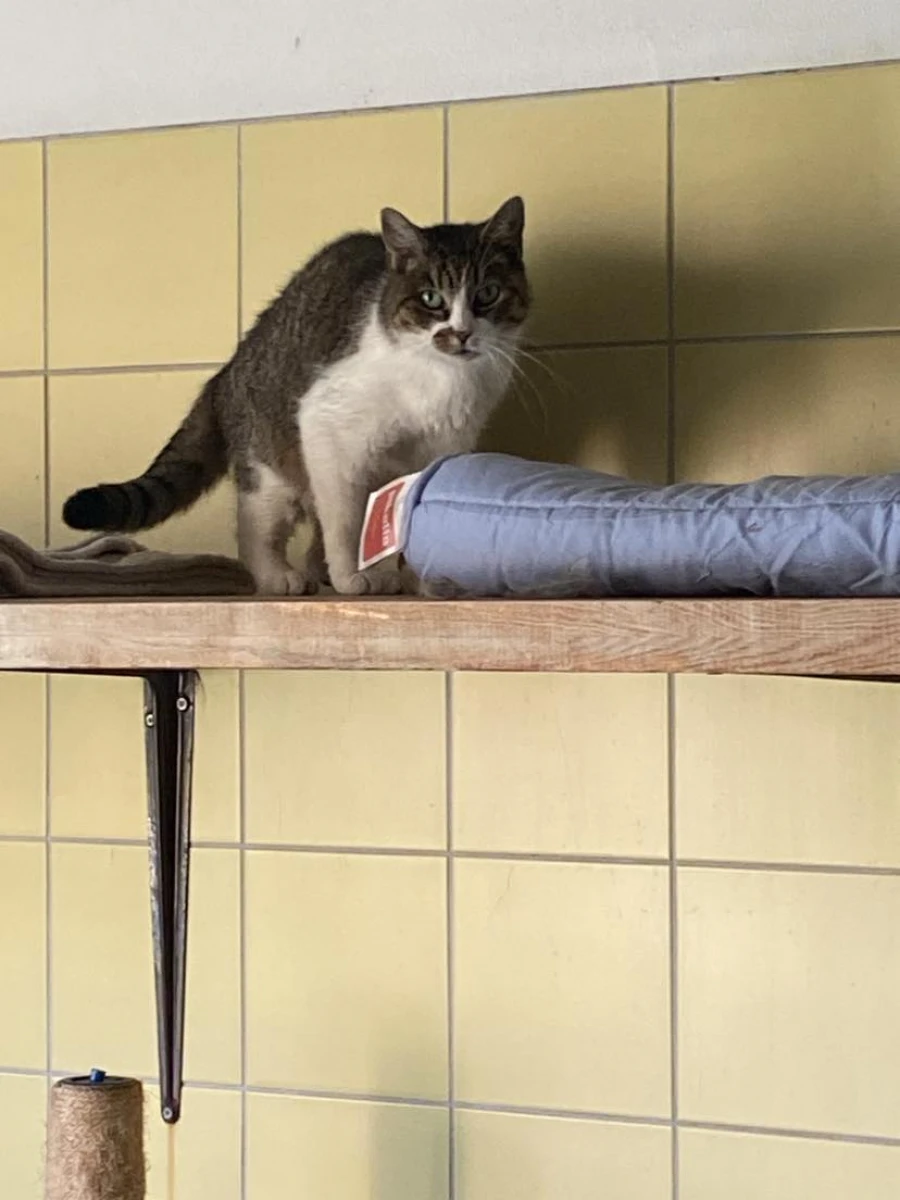 Właściciel trafił do szpitala, a ona do schroniska wraz z czterema innymi kotami. Co najdziwniejsze wydaje się jedną z najmniej oswojonych w całym pawilonie pomimo tego, że mieszkała z człowiekiem. Jest to nietypowe, ale zdarza się. Kotka ucieka na belkę pod sufitem i tam najczęściej przesiaduje, kiedy w pobliżu są ludzie.