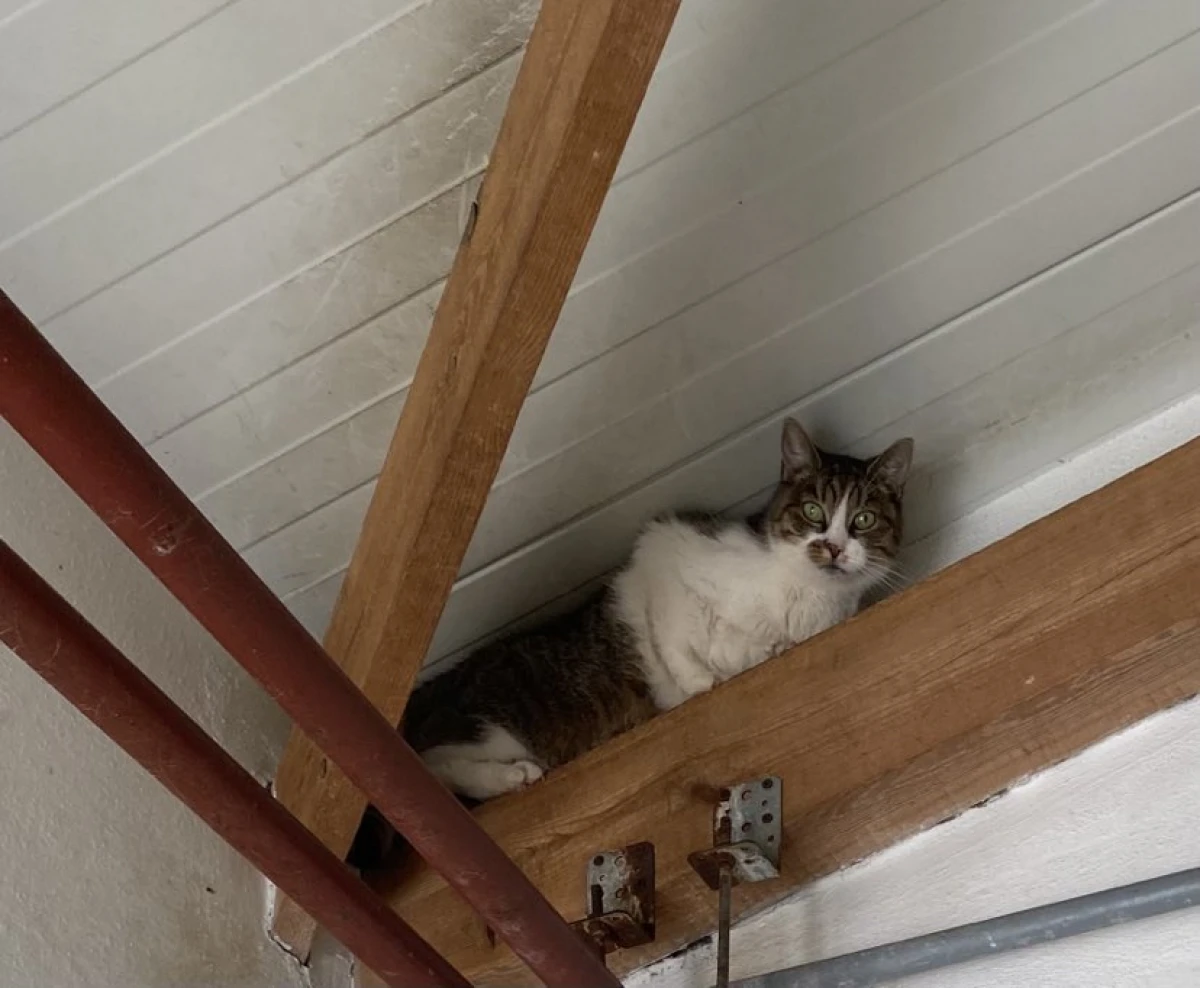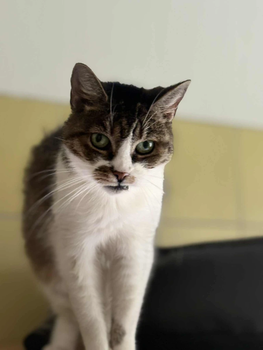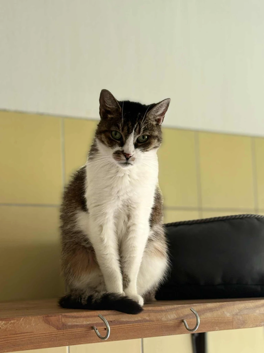 Właściciel trafił do szpitala, a ona do schroniska wraz z czterema innymi kotami. Co najdziwniejsze wydaje się jedną z najmniej oswojonych w całym pawilonie pomimo tego, że mieszkała z człowiekiem. Jest to nietypowe, ale zdarza się. Kotka ucieka na belkę pod sufitem i tam najczęściej przesiaduje, kiedy w pobliżu są ludzie.