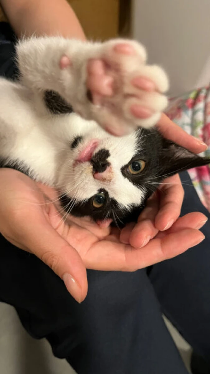 Buka to jeszcze kociątko, które mimo tak młodego wieku już zaznało wiele cierpienia. Została znaleziona błąkająca się na posesji starszej pani z poważną raną dolnej wargi – oderwaną i objętą martwicą, co uniemożliwiało jej normalne jedzenie. Natychmiast trafiła do całodobowej kliniki, gdzie przeszła operację oczyszczenia rany i zszycia tkanek.