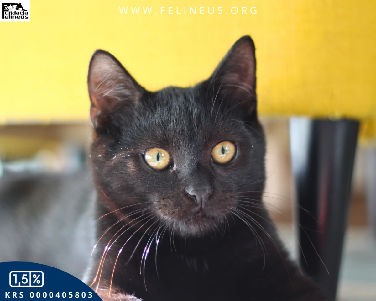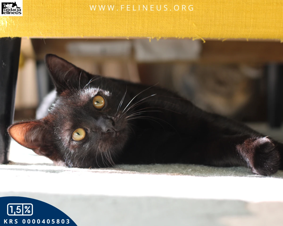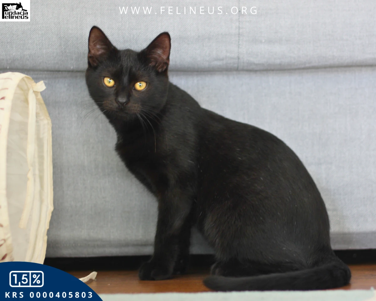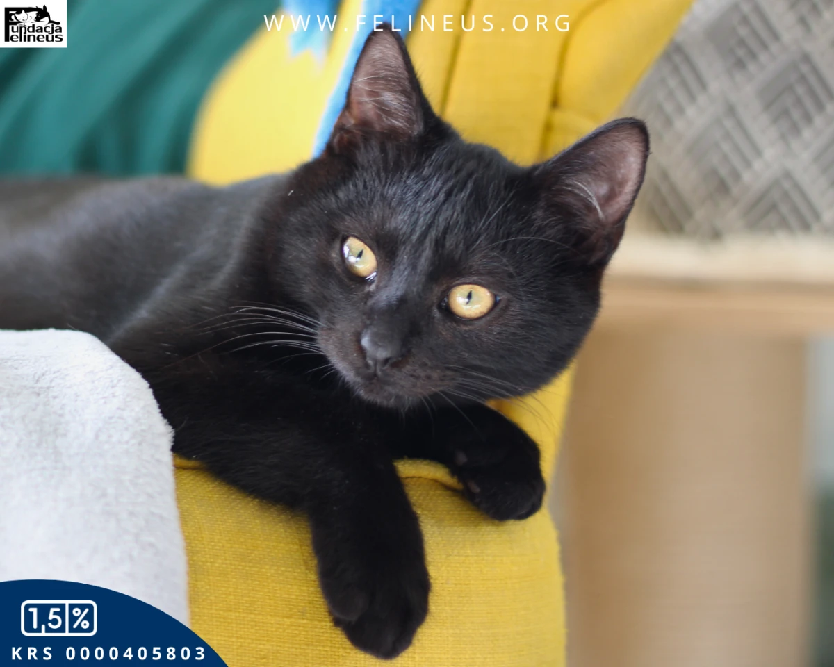 Febo, czarny kocurek urodzony w lipcu 2025r. Bardzo łagodny, bardzo spokojny, wręcz leniwy. Przyjaźnie nastawiony do wszystkich ludzi, zna towarzystwo dzieci. Śmiało można go wziąć na ręce  Nie domaga się głaskania, ale chętnie przyjmie każdą dawkę pieszczot. Nie przeszkadzają mu hałasy w domu, nie boi się odkurzacza. Poranki lubi rozpoczynać od wietrzenia futerka na osiatkowanym balkonie, wieczorem zaś chętnie zaśnie przy boku człowieka. Szuka domu, w którym będzie miał towarzystwo kocie lub ludzkie, ponieważ nie lubi być sam. Pięknie korzysta z kuwety, wie co to drapak, nie grymasi przy jedzeniu. Słowem Febo to kot idealny