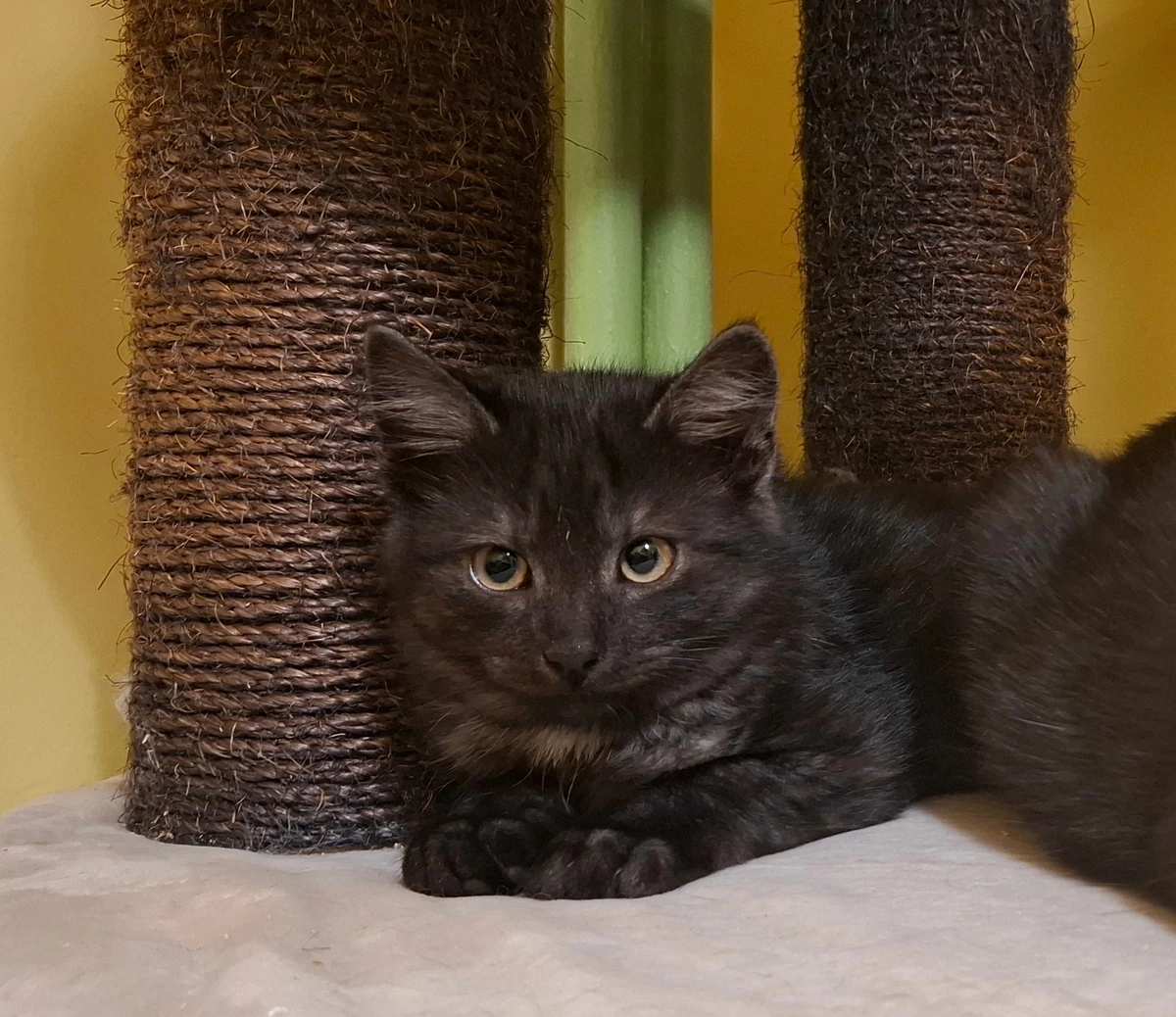 Kazu jest maleńki, ale już dał się poznać jako największy rozrabiaka z rodzeństwa. Wszędzie go pełno, wszystkiego musi dotknąć, pociągnąć, zbadać. W stosunku do człowieka jeszcze odrobinę nieśmiały, ale uruchamia traktor w mgnieniu oka - będzie z niego nie tylko wspaniały towarzysz, ale też zapowiada się na kota o sporej kreatywności.