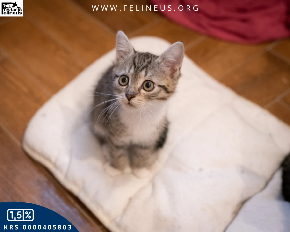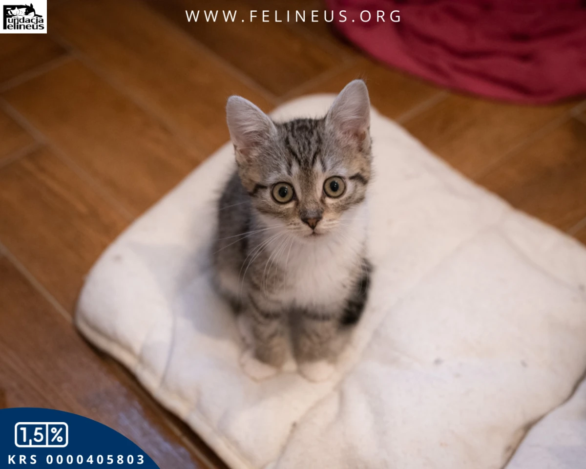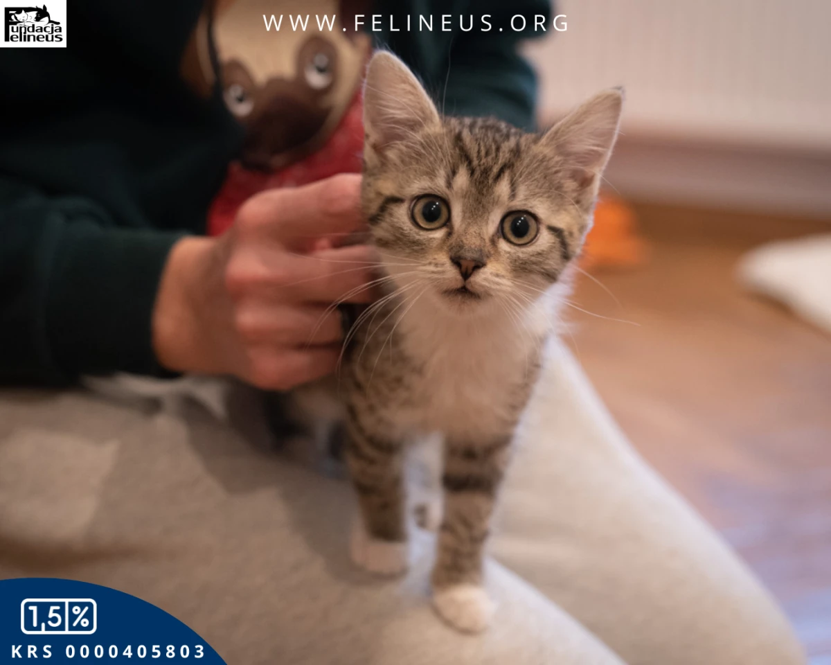 Lala – kotka urodzona w październiku 2023r. To przepiękna buraska z białymi dodatkami. W jej ogromnych, błyszczących oczach można zakochać się od pierwszego wejrzenia. To przytulasta, poczciwa, mrucząca koteczka. Jest bardzo delikatna i kontaktowa. Uwielbia zabawy, szczególnie kolorowymi piłeczkami. Kicia szuka kochającego domu, do którego może iść sama, lub z którymś z kociaków z rodzeństwa.