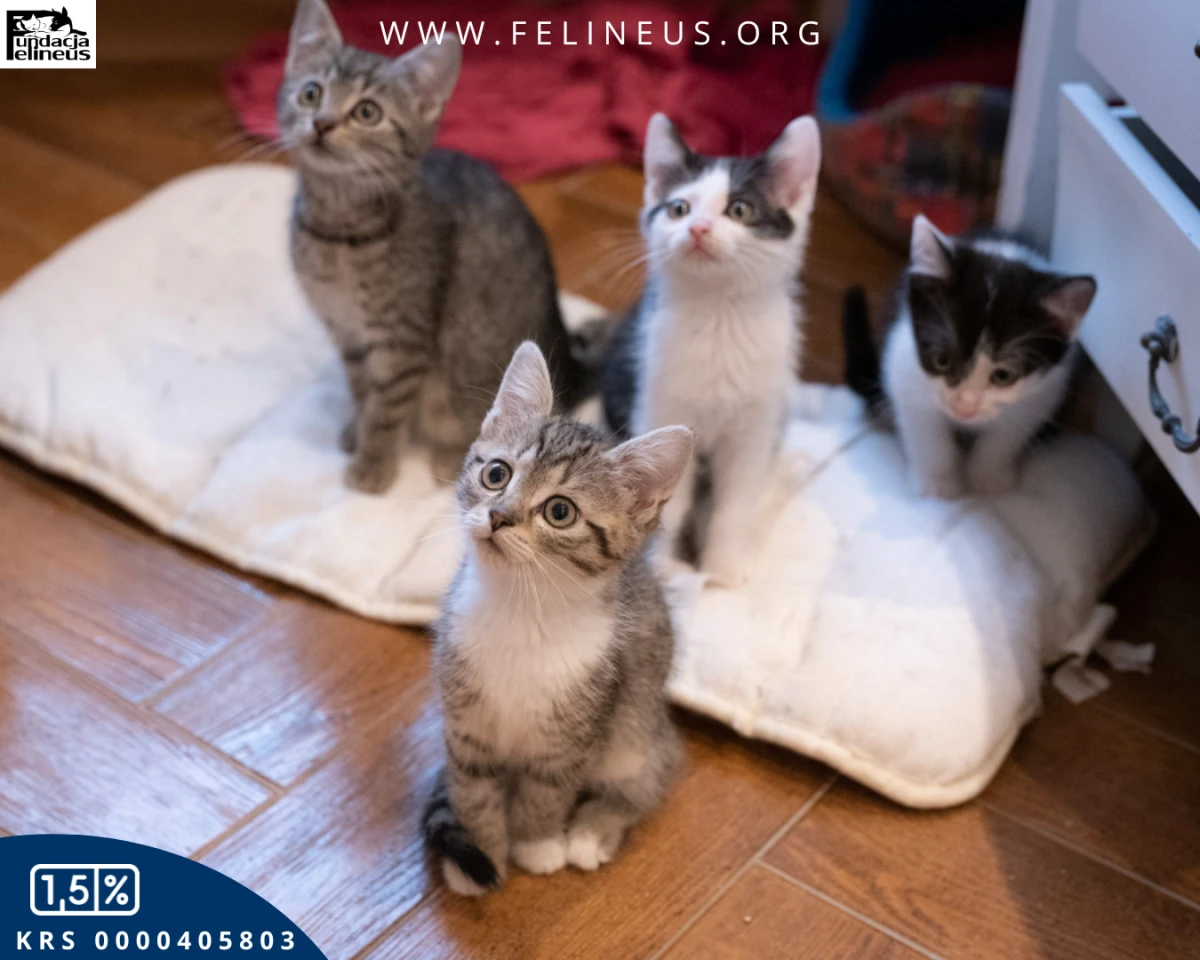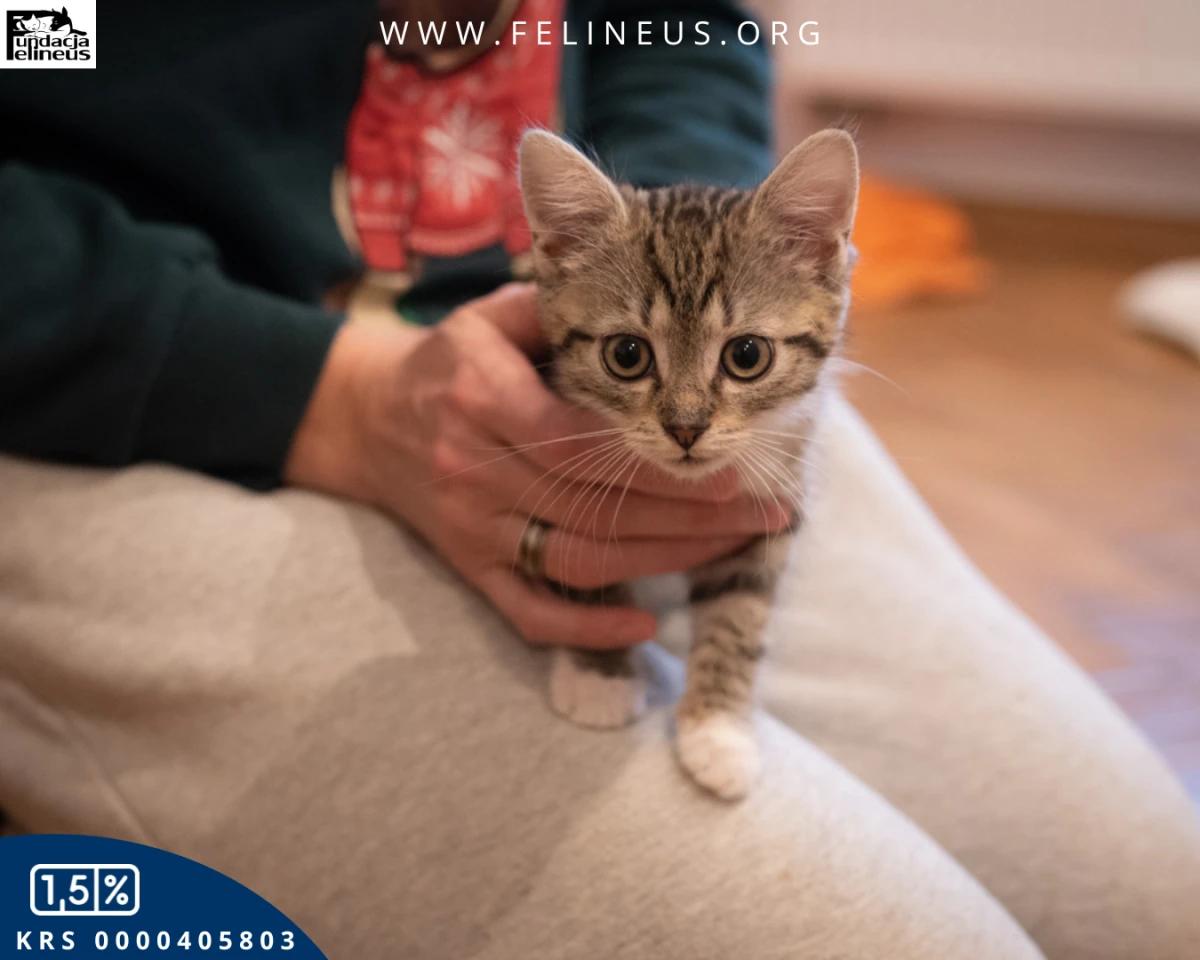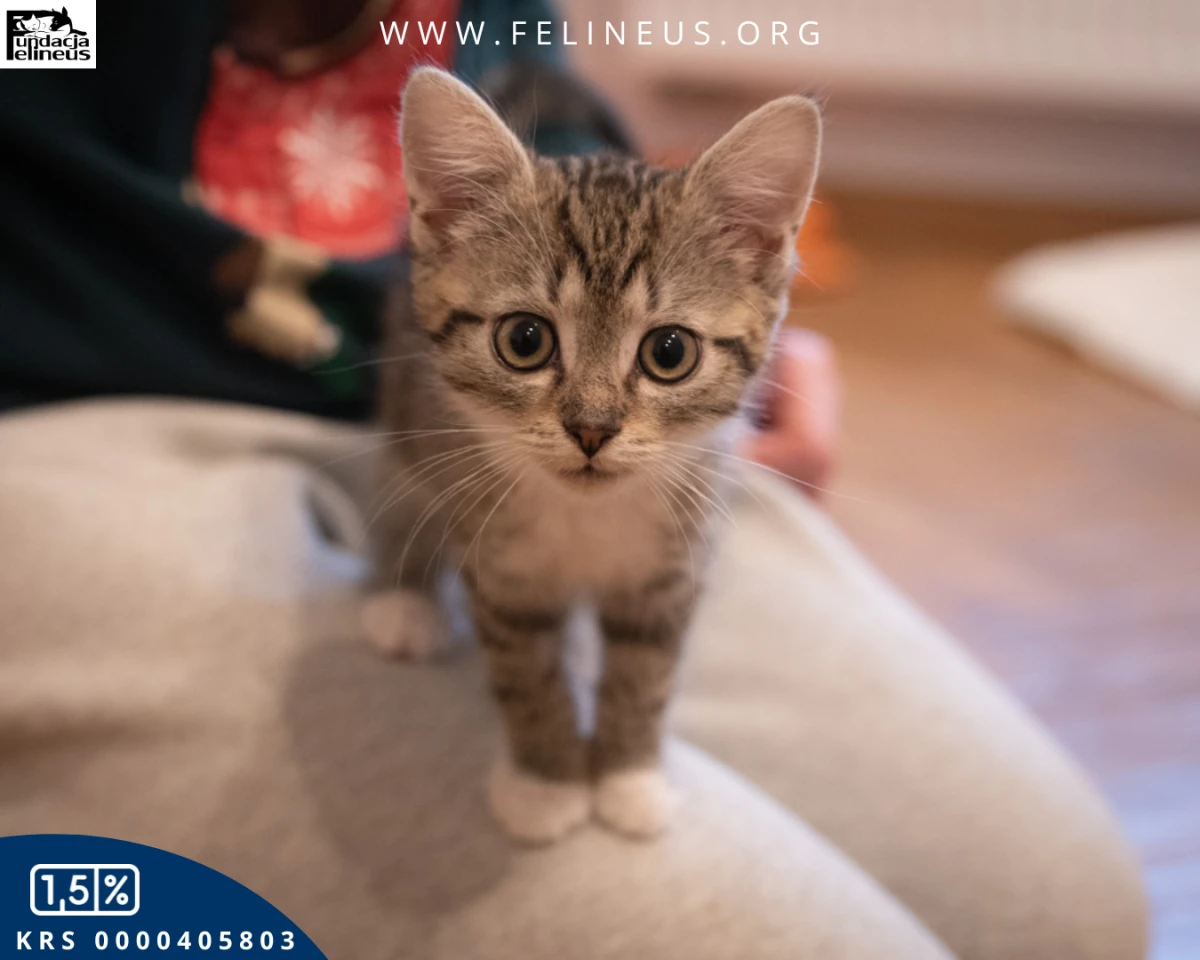 Lala – kotka urodzona w październiku 2023r. To przepiękna buraska z białymi dodatkami. W jej ogromnych, błyszczących oczach można zakochać się od pierwszego wejrzenia. To przytulasta, poczciwa, mrucząca koteczka. Jest bardzo delikatna i kontaktowa. Uwielbia zabawy, szczególnie kolorowymi piłeczkami. Kicia szuka kochającego domu, do którego może iść sama, lub z którymś z kociaków z rodzeństwa.