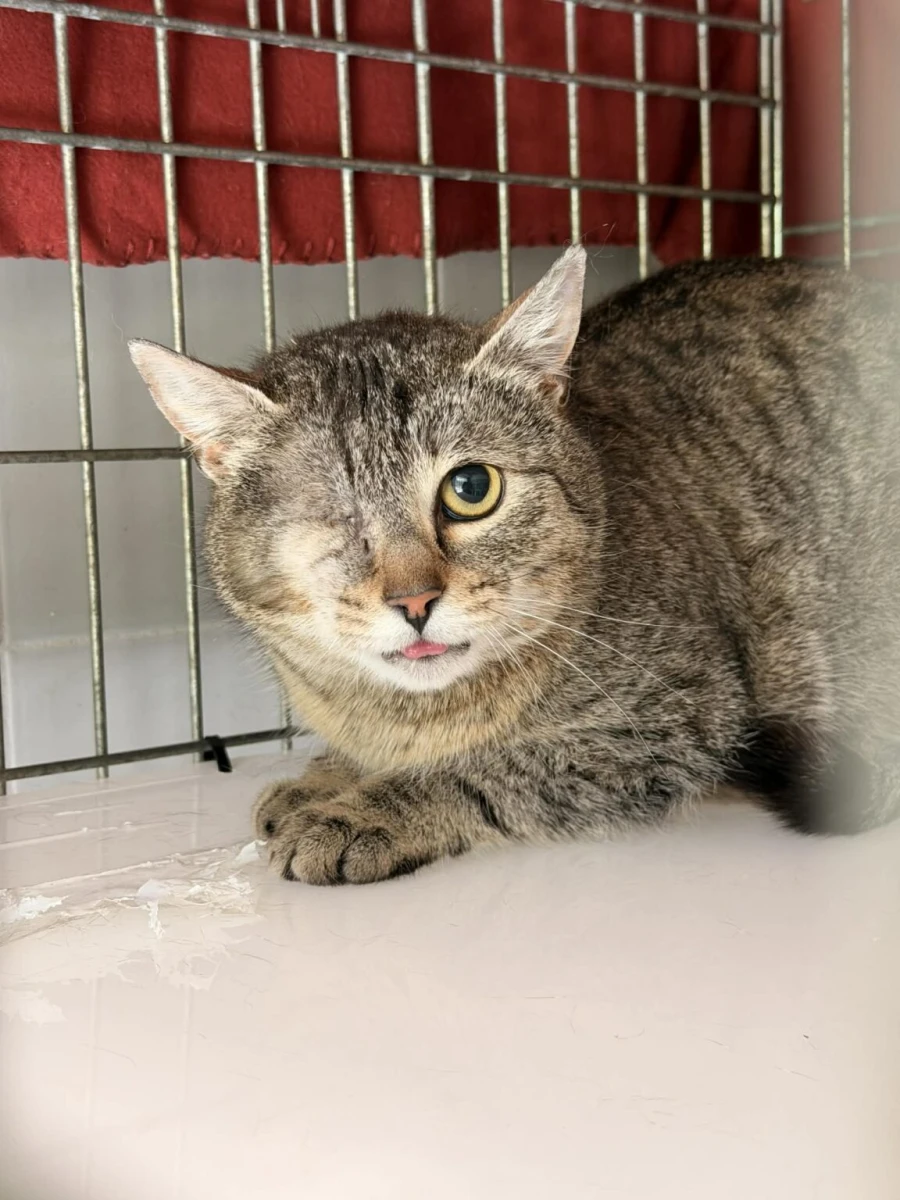 2-letnia bura koteczka Linda, która trafiła do nas jako znaleziona. Miała uszkodzoną gałką oczną, którą nasi lekarze weterynarii zdecydowali się usunąć. Koteczka jest już po wymaganym okresie rekonwalescencji po tym zabiegu, czuje się dobrze i powoli zaczynamy poszukiwać dla niej nowego domu.