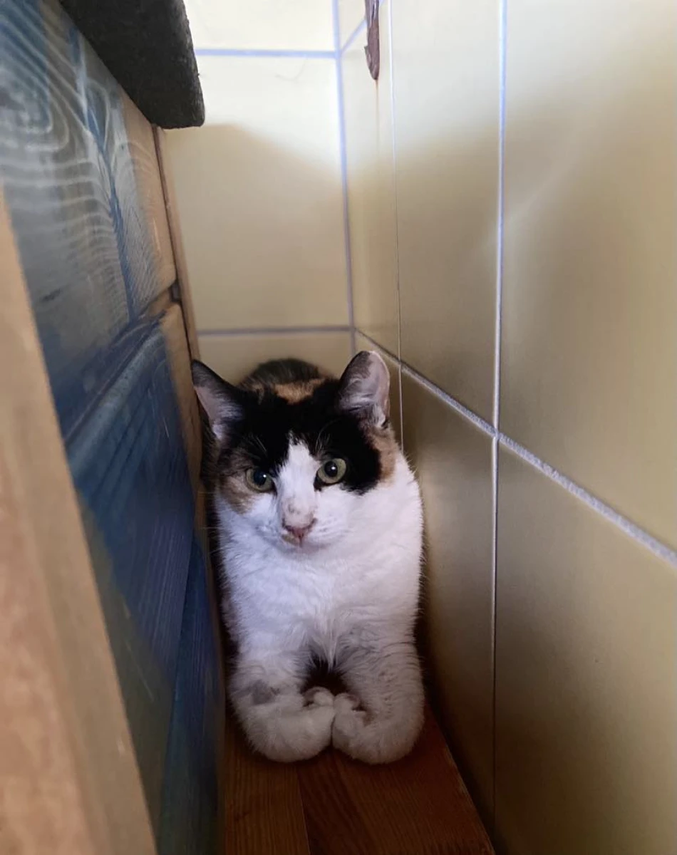 Niestety Malwa jest też bardzo płochliwa, chowa się lub siedzi na belce. Jest na pewno nieoswojoną kotką, unika ludzi. Cierpliwie jednak czekamy aż da nam znak 😊 To jeszcze młoda kotka, ma szanse na częściowe chociaż oswojenie, najlepiej w warunkach domowych.