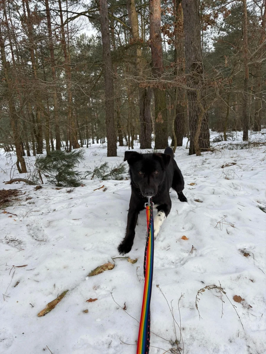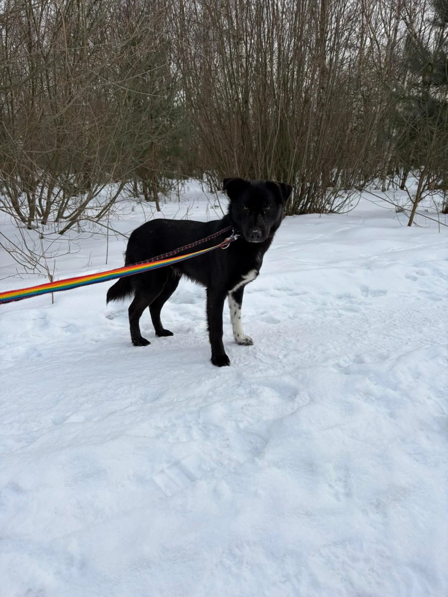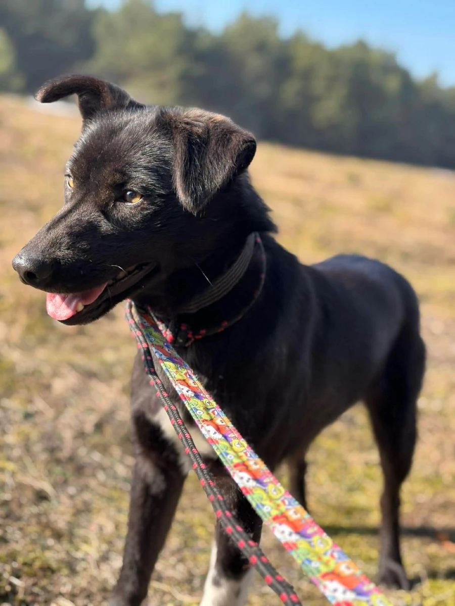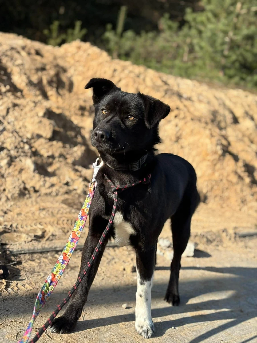 Chip to ok. 2-letni, czarny smukły piesek z uroczymi białymi „skarpetkami”. Jest zgrabny, sięga głową do kolana. Został znaleziony na wsi razem ze swoim bratem, Dale. Chip jest psiakiem delikatnym, wycofanym i nieśmiałym, ale z każdym dniem coraz bardziej otwiera się na kontakt z ludźmi. Jest ciekawski, a do jego serduszka najłatwiej trafić… smaczkami - wtedy jego zaufanie rośnie w oczach. Unika obcych, ale na widok znajomych opiekunów cieszy się jak szczeniak. Można go głaskać, czesać i choć jeszcze czasem czuć, że jest spięty przy dotyku to każdego dnia widać w jego zachowaniu coraz więcej zmian na lepsze!